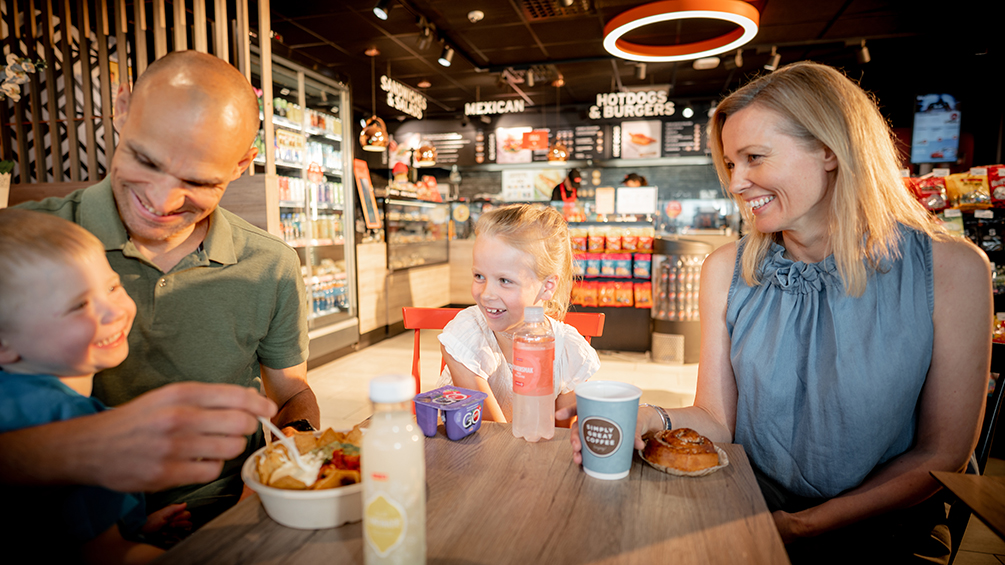Drikk en kaffe, ta en pause og nyt den gode maten i våre flotte sitteområder. Delikate farger og spennende belysning gir en rolig atmosfære der det er behagelig å slappe av; enten i en sofa med vennegjengen eller familien, eller en rask pause ved et barbord. Vi har stor og god toalettkapasitet og det er WiFi til fri disposisjon; alt har blitt designet for å gi deg en god og effektiv opplevelse når du besøker oss.